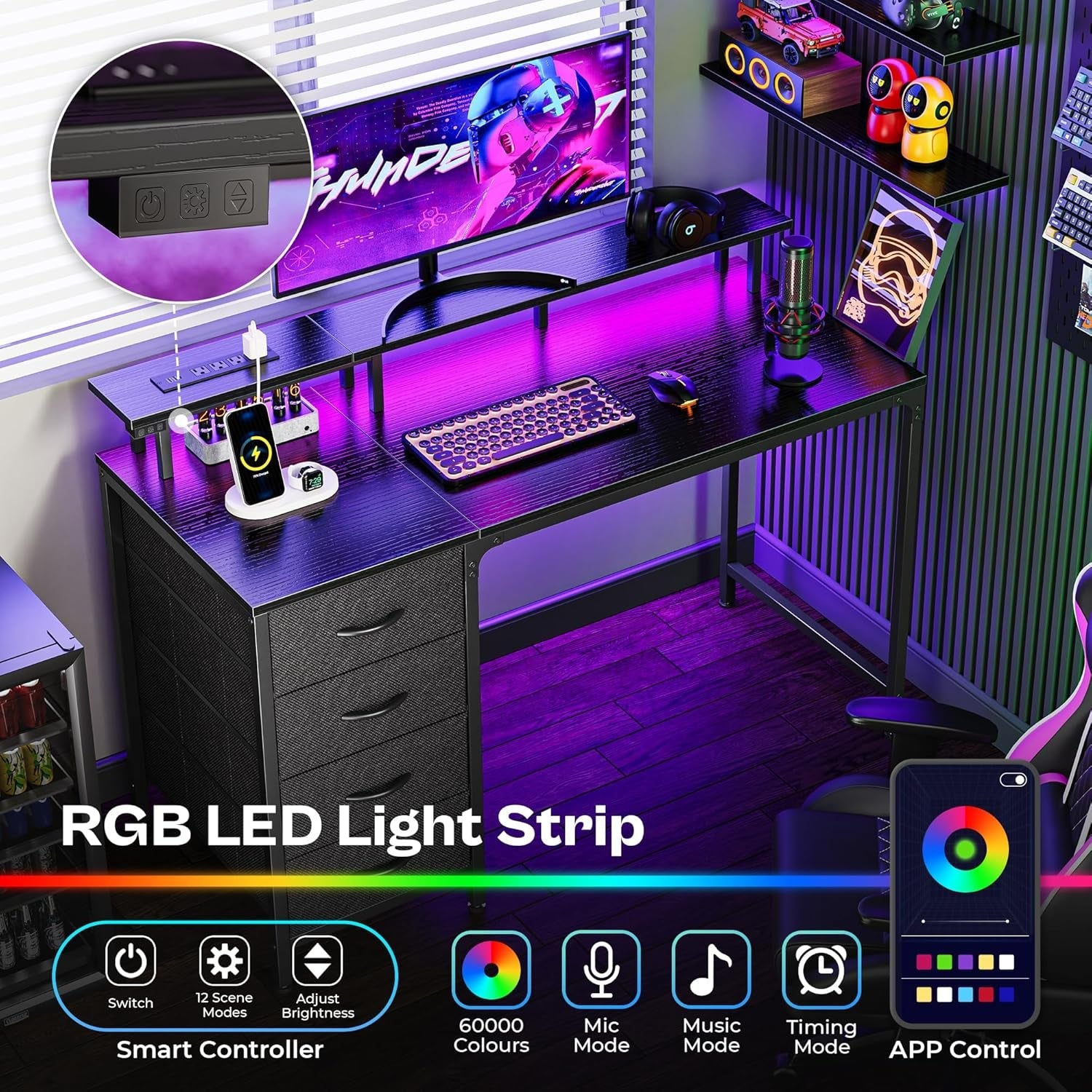 47 Inch Computer Desk with Power Outlets and LED Lights, Gaming Desk