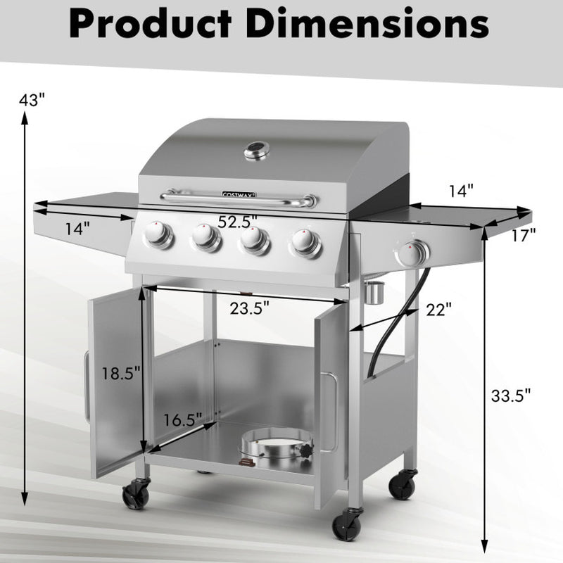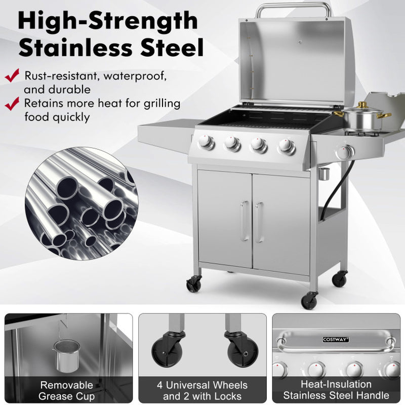 - Powerful Burners: Equipped with four stainless steel burners and one side burner, generating a total of 40,000 BTUs for effective heat control and cooking.