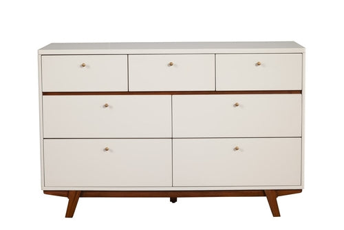 Add personality to your bedroom style and a feeling of coziness with this 56" brown and white solid wood seven drawer double dresser. Designed for you to stand in front of and get ready, this horizontal double dresser has a convenient and wide top area for your getting ready needs and supplies. Loaded with capacity, this piece is equipped with seven easy open drawers for practical and good looking clothing storage. This dresser is built to last from high quality solid wood,. 36" H x 56" W x 18" D