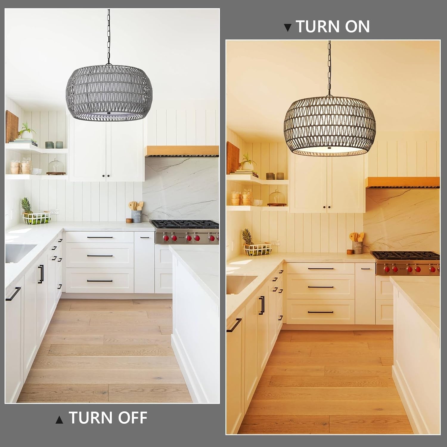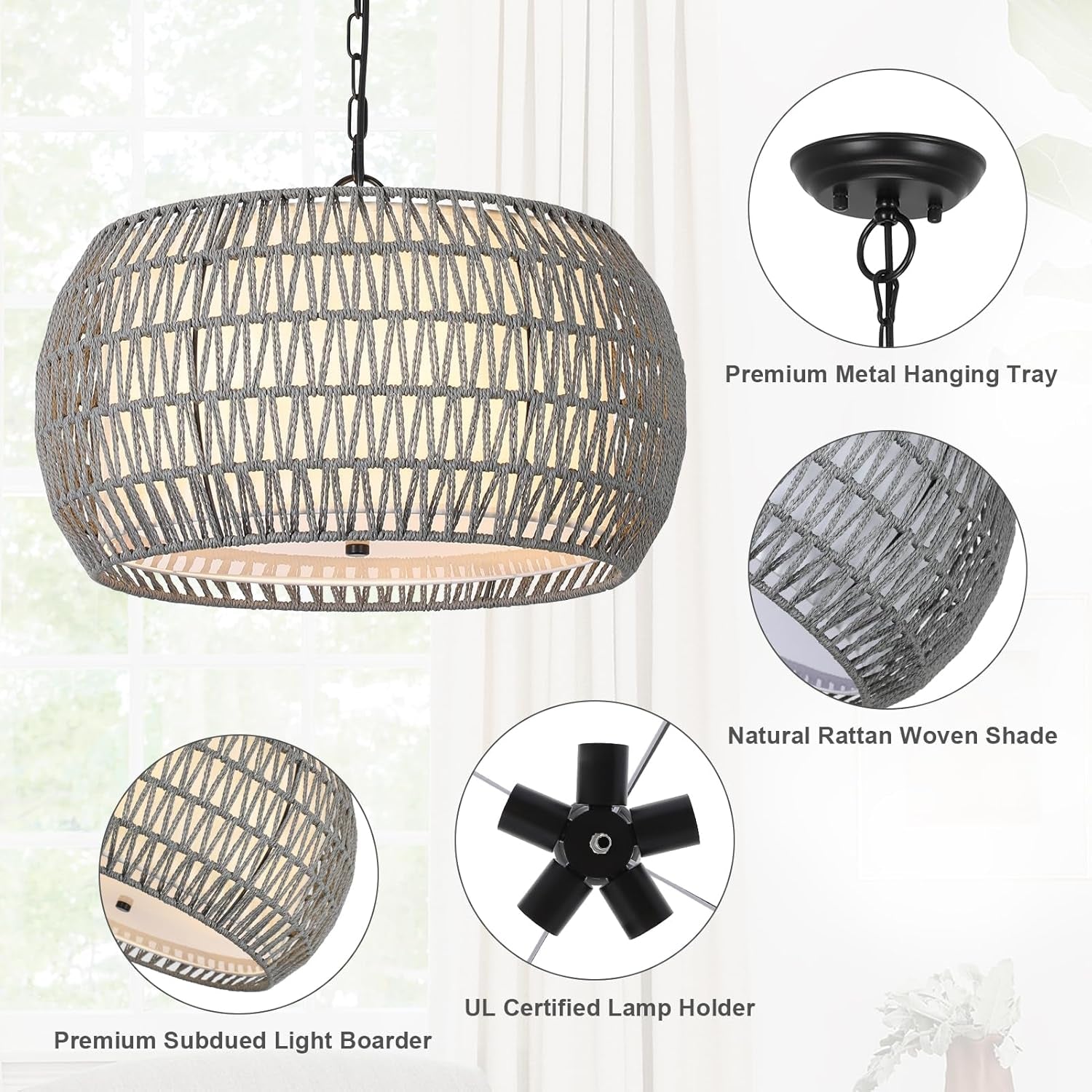 - 5-Lights Fixture: This dining room chandelier features a hand-woven rattan design that emits a beautiful 360° light shadow, enhancing the bohemian atmosphere of your home.