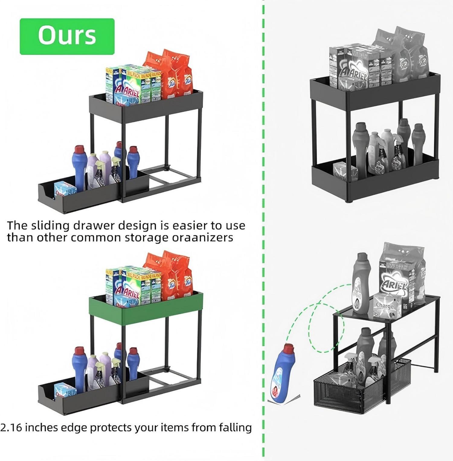 Under sink organizer is a vertical design with two levels above and below. and a flexible sliding drawer design with handles at the bottom provides easy placement and removal of items in a limited space. No tools required,just follow the instructions on the box to install.