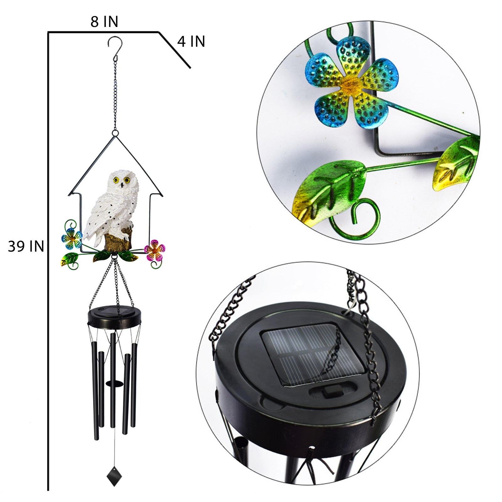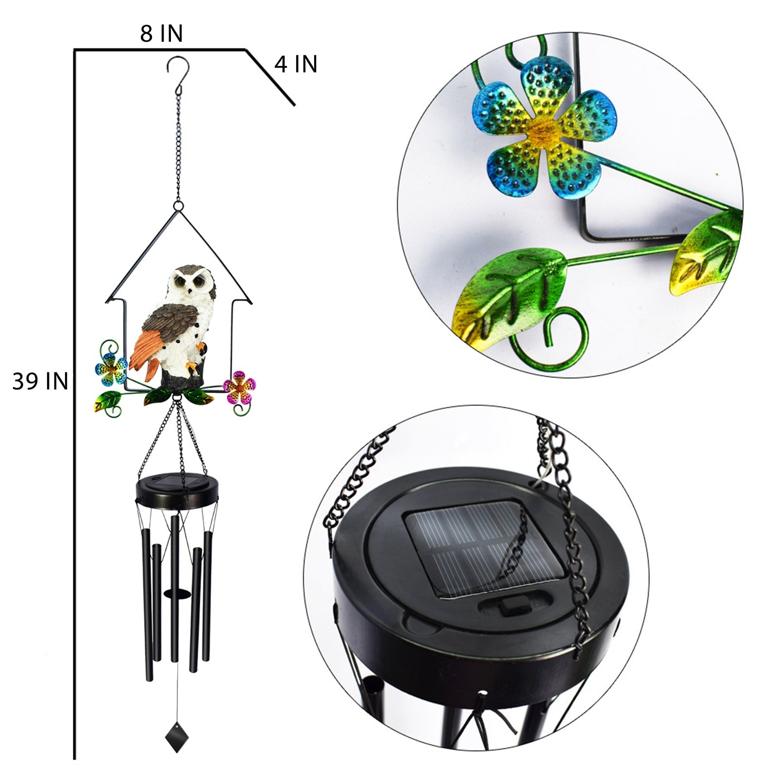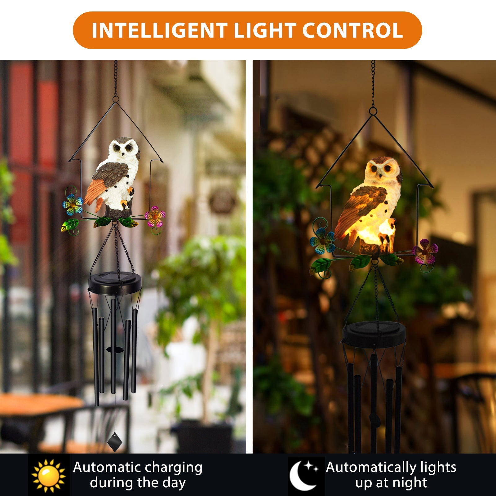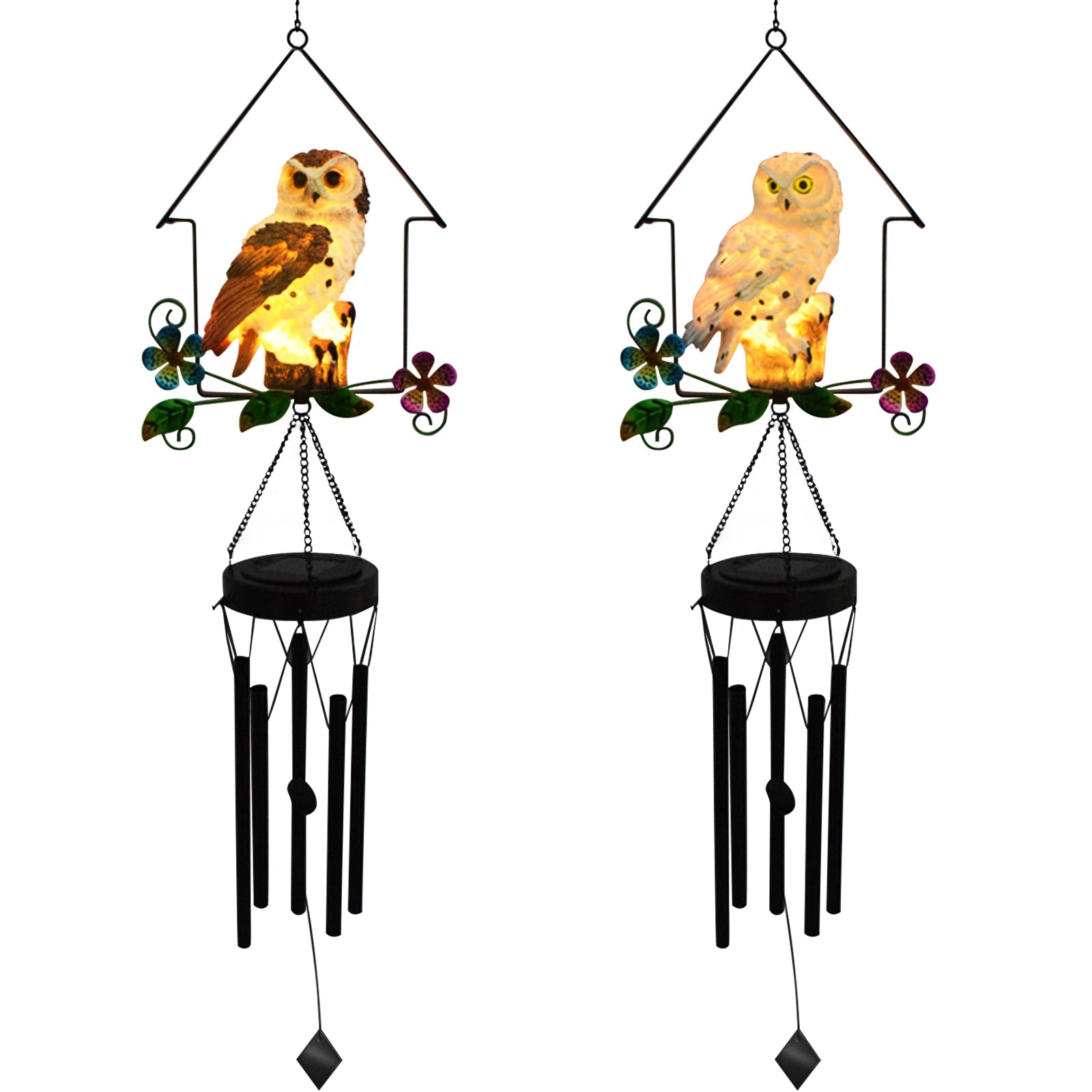 Lifelike Owl Sculpture & Solar Wind Chime Light - This solar owl wind chime decor light is made of resin Owl Sculpture, metal wind chime and solar LED light. The owl stands on the wind chime and sways vividly lifelike.