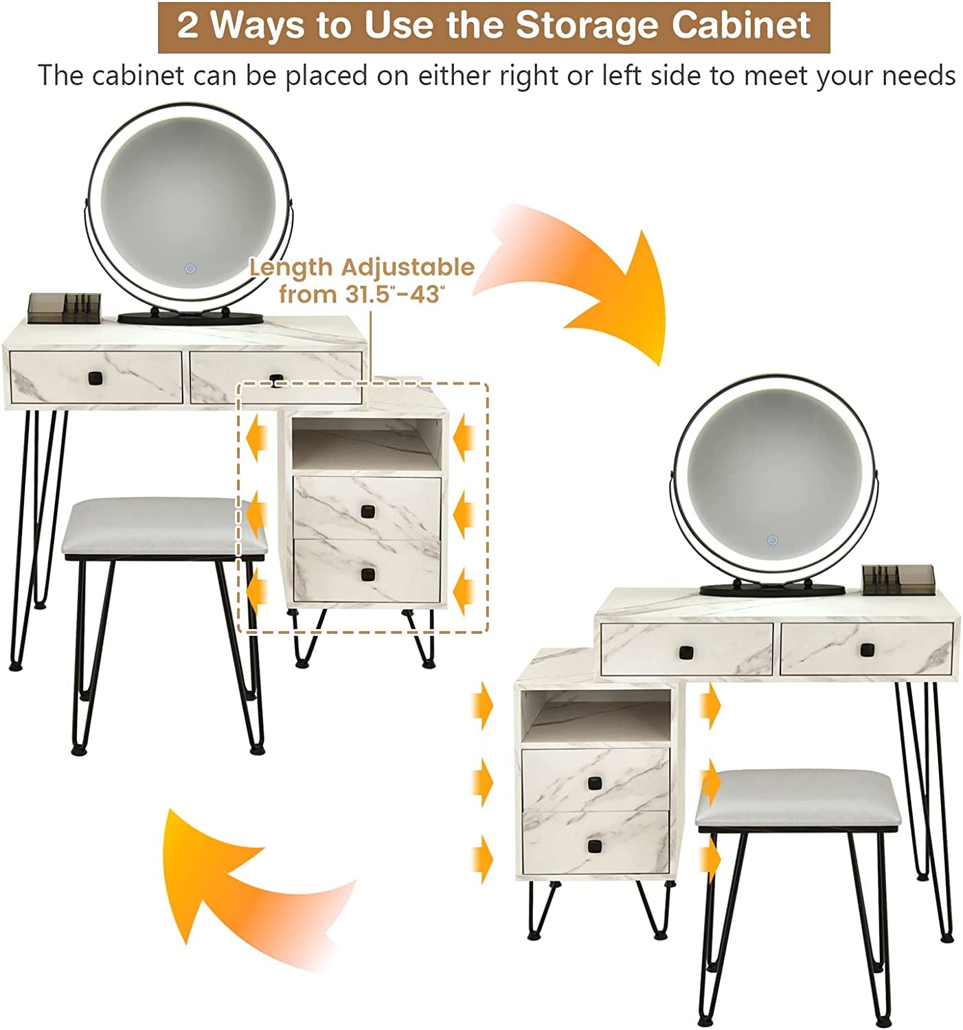 - 【Side Cabinet & Additional Storage Box】: The side cabinet can be installed on either left or right side as you like. In addition, the transparent storage organizer on the tabletop can store your lipsticks, brushes, perfumes, etc.