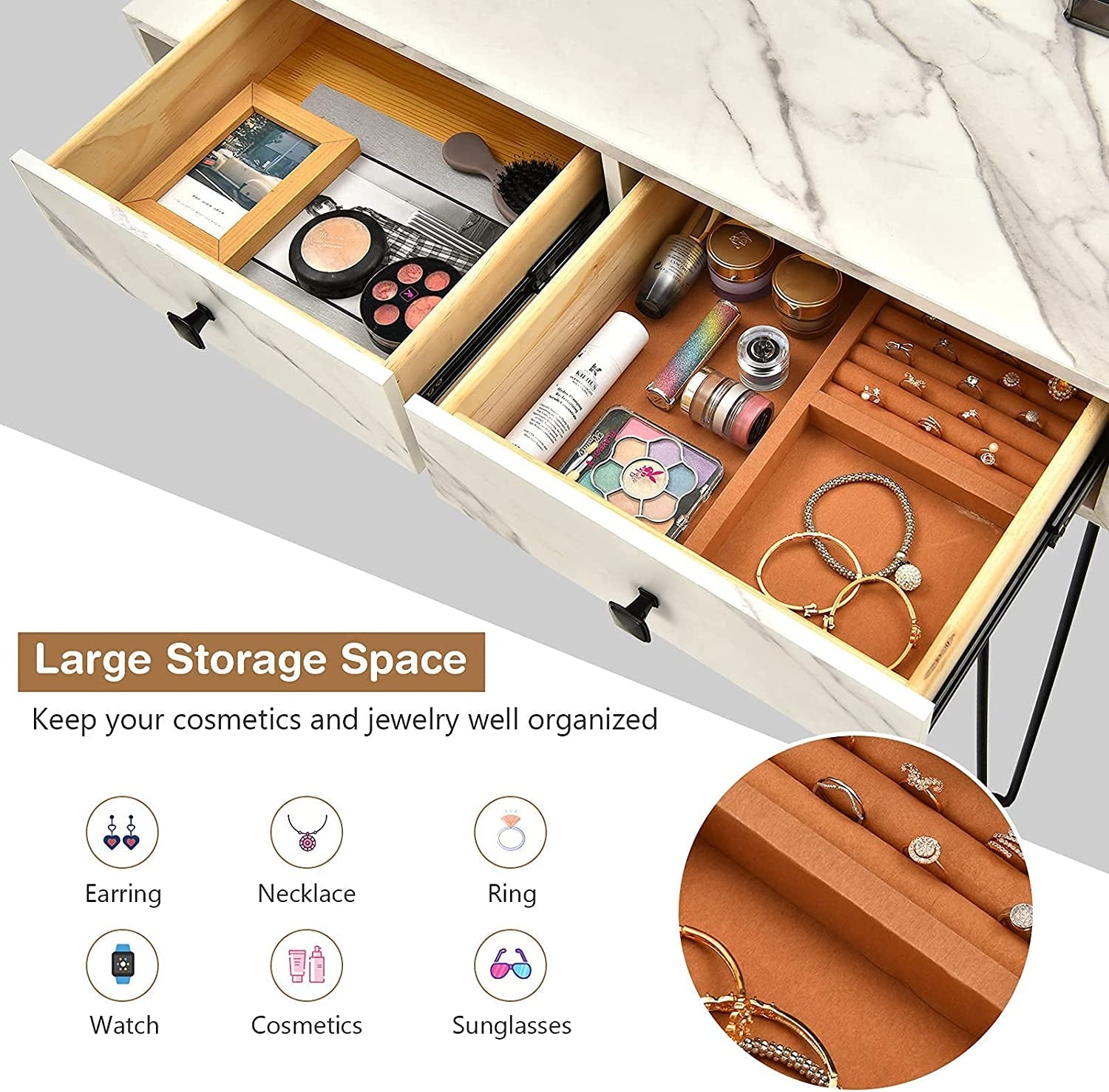 - 【2 Large Drawers with 1 Jewelry Organizer】: Two large drawers will definitely provide enough storage space for you. One of the large drawers has a ring slot and compartments while covering with soft flannel to give your jewelry the best protection. All your beauty essentials will be organized at one place.